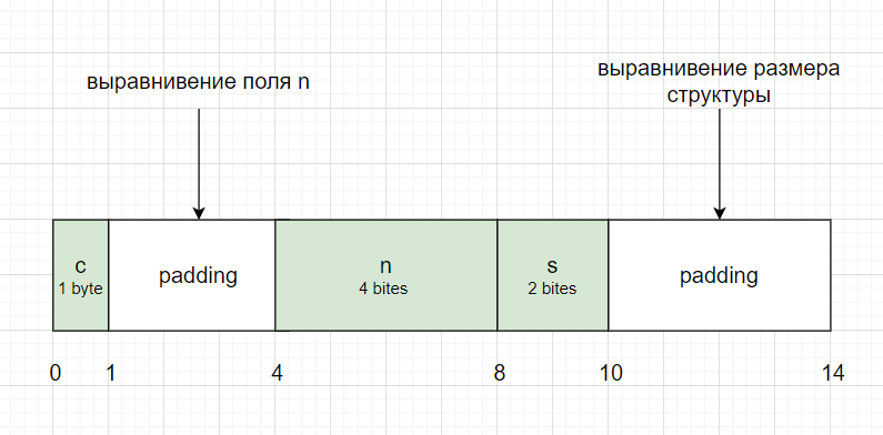 Дополнительно, размер структуры выравнивается кратно размеру самого большого поля. Это необходимо для минимизации количества циклов, когда структура размещается в массиве. Для этого padding-поле добавляется в конец структуры.